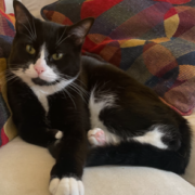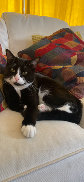 A tuxedo cat. He has yellowish/ green eyes. He has little pink paw beans. He has never been outside before- strictly an inside cat. He will probably be very nervous but he’s great with other pets and people.