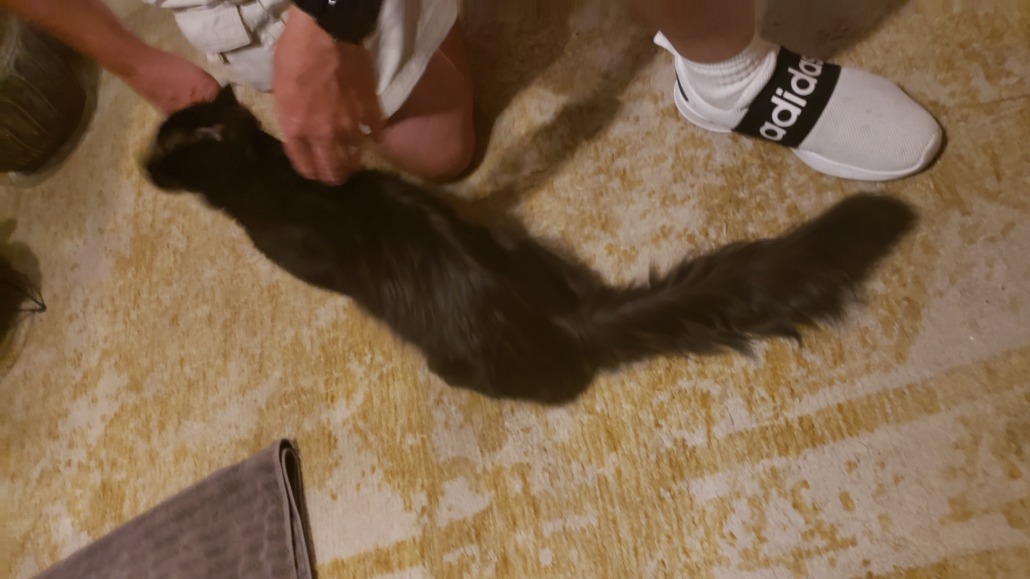 Black male cat with bushy tail.