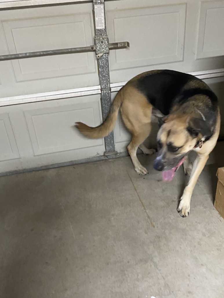 Large male black and tan dog appears to be A German Shepard mix found wandering our neighborhood