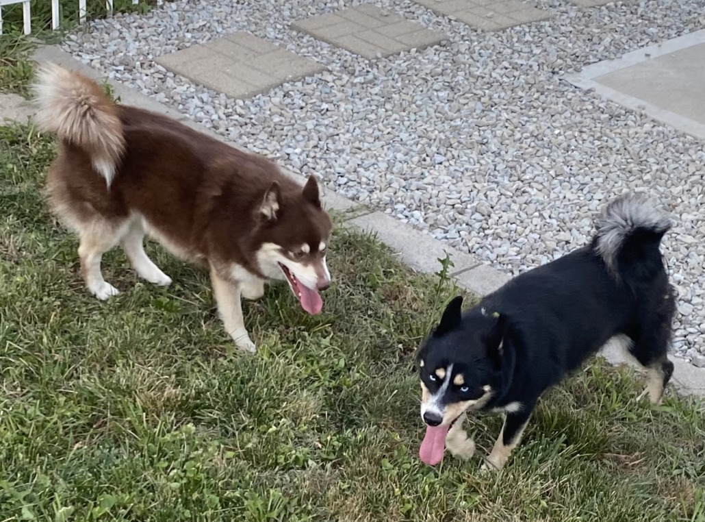 2 Shiba mix with husky markings found without tags: 1 blk/tan/wht; 1 brn/wht. Only 1 dog has collar. Proof of ownership, photos required for return!