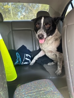 This dog is probably about 25-40lbs.. she’s black and white. Kind of looks like a border collie mixed w Australian shepherd maybe??? Idk anything about dog breeds lol.. she has some back hair missing.. no collar. Looks like she’s been out for a few days, or just an outside dog that got out..