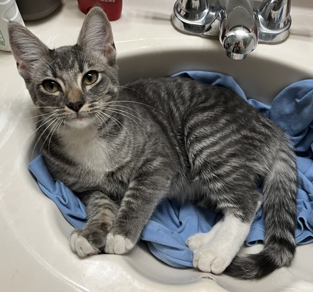 Very sweet and friendly 6 month old kitten. grey tabby with white belly and paws. not spayed or chipped. proof of the ownership is required.