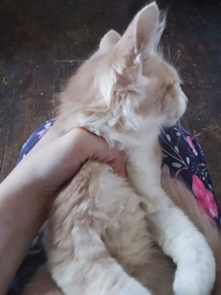 He’s an orange and white Maine Coon he is 3 months old he has a blue collar on