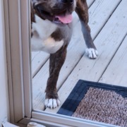 Brindle male. Not food aggressive. Seems to like other dogs and kids.
