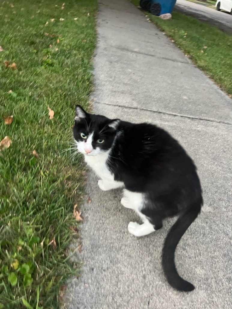 Sweet black and white cat // think it may be an indoor cat as it followed me all the way home after I started petting it on my walk and wanted inside my house // top of left ear is slightly cut off (Assuming means neutered // has been kneading on my blanket when I brought it indoors // jumped on my chest and wanted attention/petted