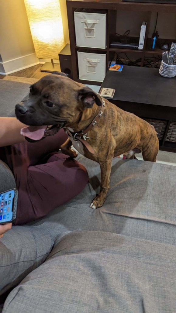 Dog found at corner of 19th and college. Looks like a pit mix, brown with a black nose. The collar has metal dog bone studs.