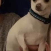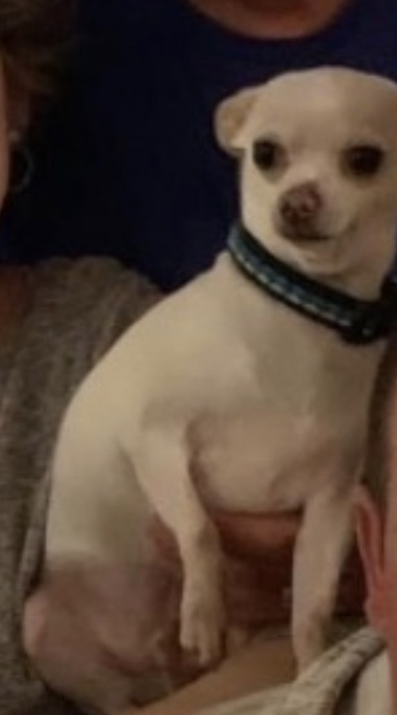 Small, white, squinty-eyed, short-haired chihuahua.