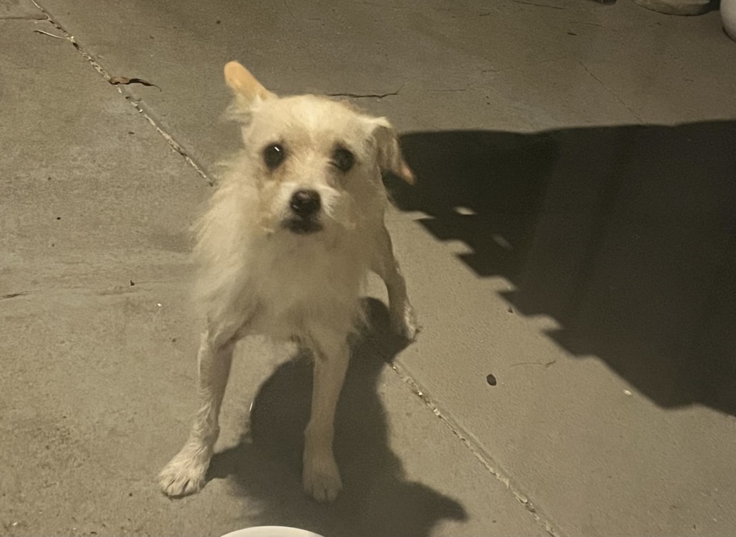 This little guy is friendly but very skiddish / scared. He is pretty dirty and looks to have fleas. He comes up to us when we speak softly and is very friendly. No collar is being worn.