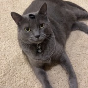 Solid dark gray cat, tail has very subtle striped markings similar to a tiger-striped cat. Very slight hints of white fur near whiskers. Under fur, skin has a blue-ish tint. Very friendly and affectionate in a home setting, but can be timid/frightened easily if outside.