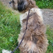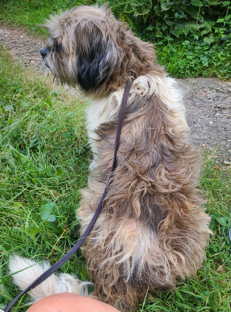 Wiry haired, white with black and tan spots. Matted. Very sweet. Didn’t bark at my cats at all.