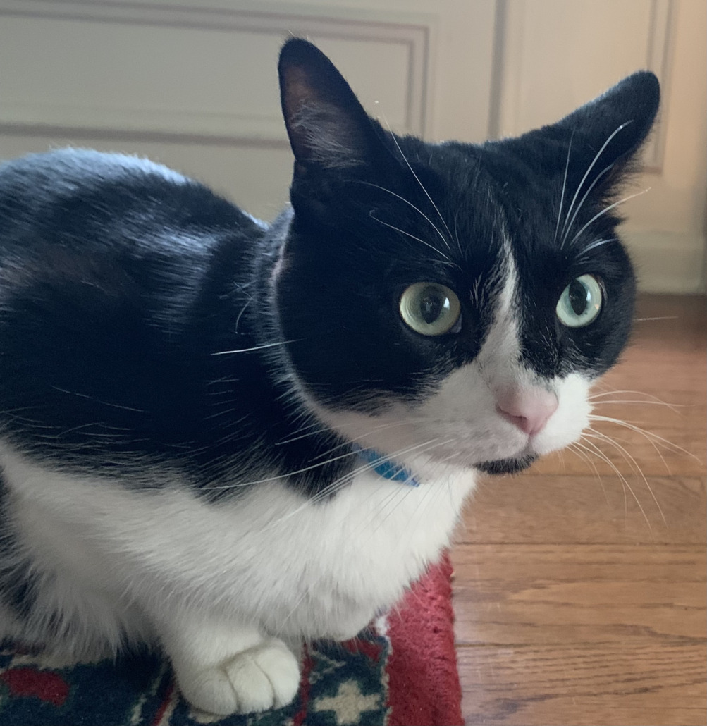 Large, black and white, very friendly cat. Large green eyes.