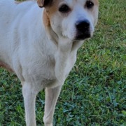 Sweet, timid girl dog recently had pups. She has a couple carmel colored spots and a carmel color head.