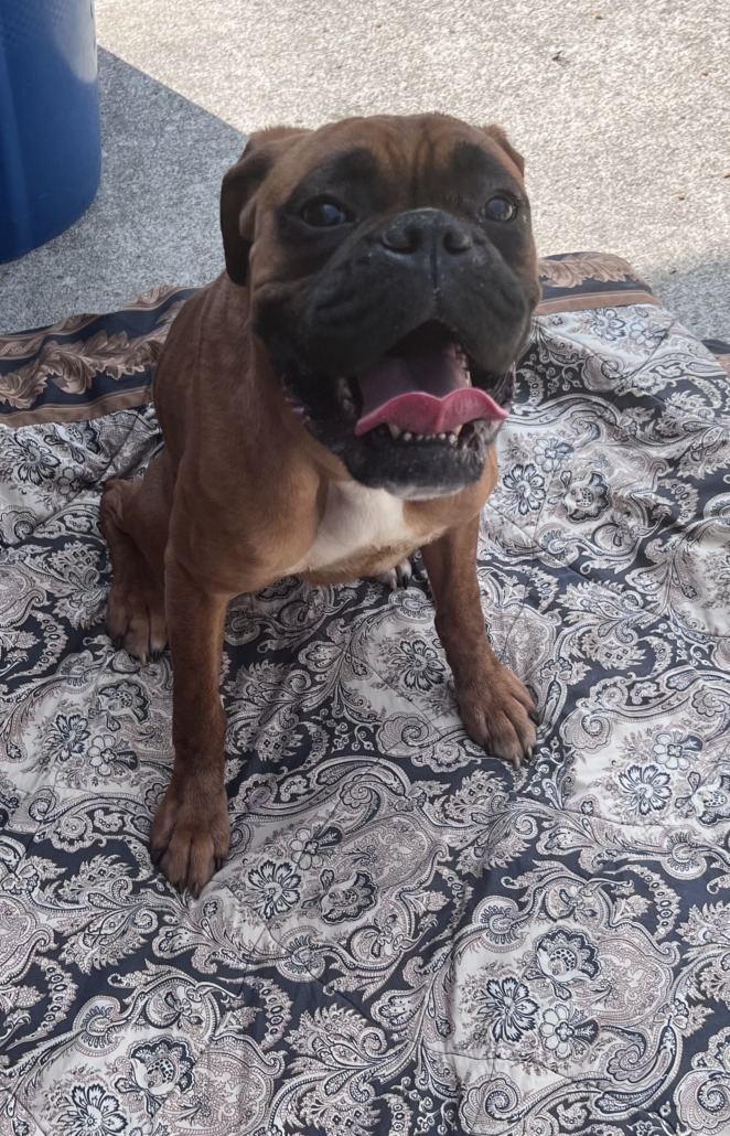 Male Boxer. Brown. Has not been spayed. Seems to be fairly young.