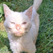 White with some orange (or just dirty). Very rough shape – missing eye, infection on foot, very skinny. Friendly.