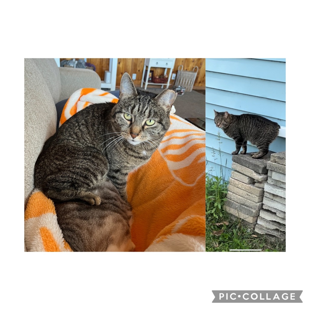 Black and brown striped, clipped ear, missing tail. Very sweet. Was wearing a collar, it’s possible she no longer has it on.