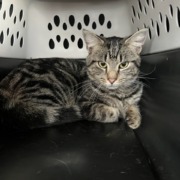 Dark unique tabby pattern. Swirl pattern on side and striped on spine. Pink nose. Super friendly and loves to be pet. Looks and acts super young, maybe a year old. MUST have proof of ownership and/or photos for proof.