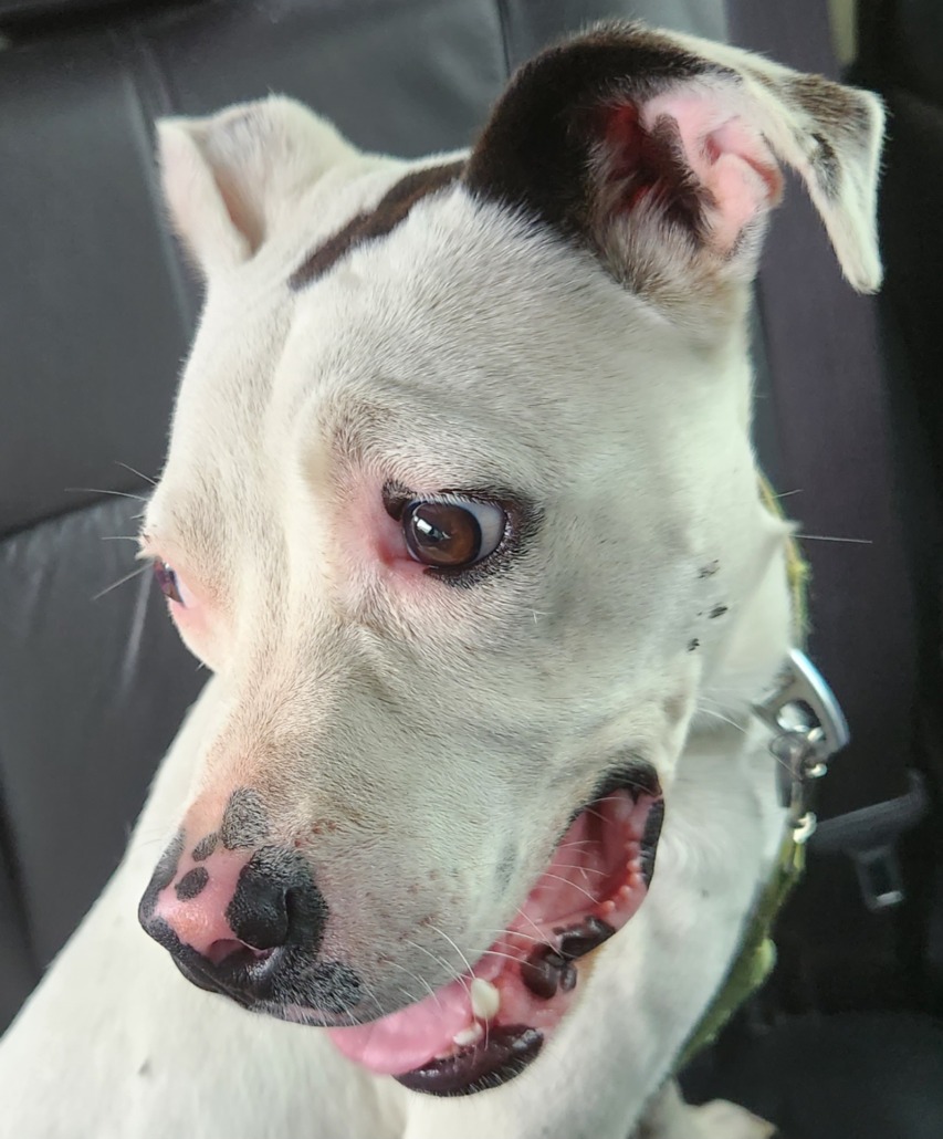 Black and white spotted potentially pit mix. She is very friendly. Found on Euclid avenue and 38th street.