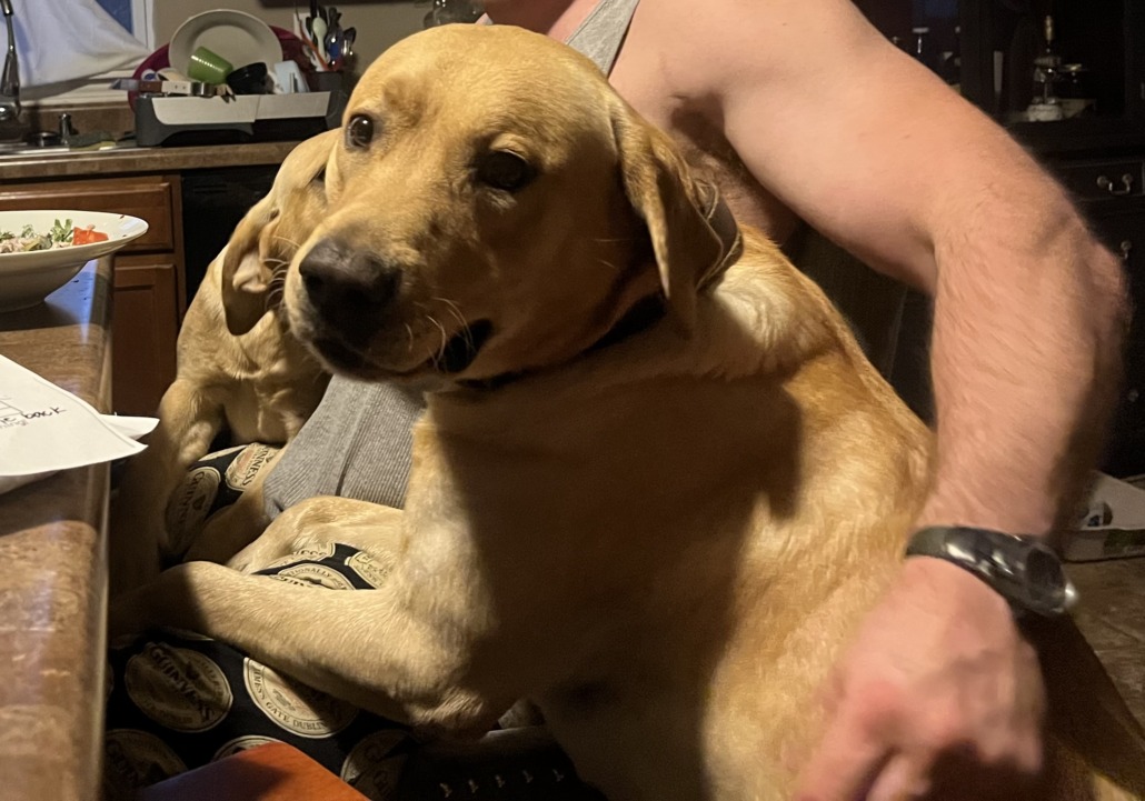 Golden lab, male, 2 years old. He has not been neutered. He has a collar on with her phone number.