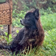 Rascal is a black-haired intact male Pomeranian (I think — or maybe he’s a Schipperke). When the vet scanned his chip, they told me his name (and that he’s 11 years old).
