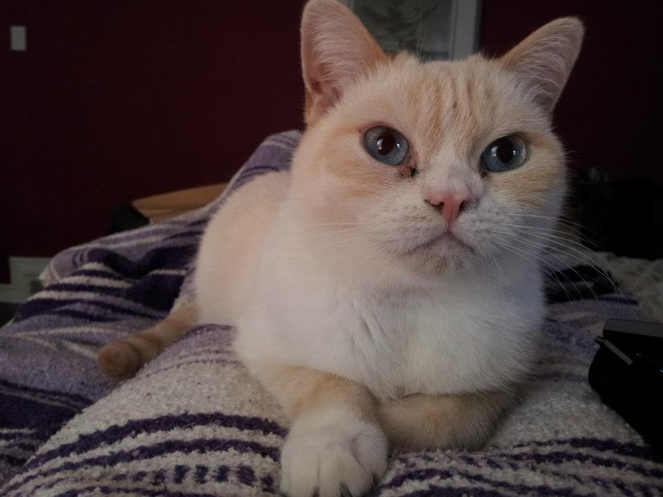 Carphie (aka Bud Bud) is a male flame point Siamese (cream/off white fur with beige/orange on ears and tail) with a “exptic” face (i.e. Persian type small nose) with bright blue eyes. He ways around 8 pounds. He is very friendly but is not used to being outside.