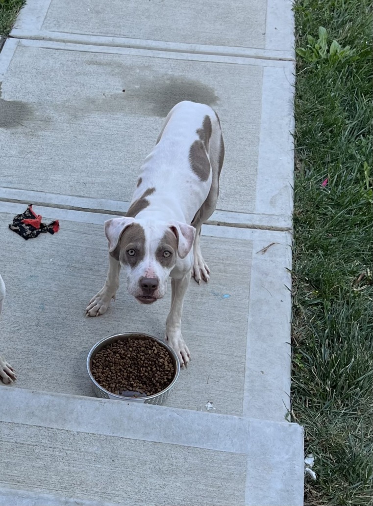 White and brown spotted pit. She is about 5 months and friendly towards friendly people. Does not like other dogs and does not react well to aggressive or scared people.
