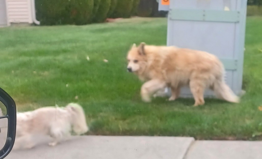 Large tan dog with collar, slight limp and styes on both eyes running with small dog