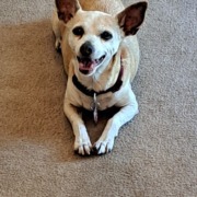 Tan/Sandy brown Chihuahua mix with gray/white hair on her muzzle and legs. Our adorable girl is approximately 15-16 years old and needs her medicine. She is a little shy, but sweet and friendly. She is wearing a red collar.