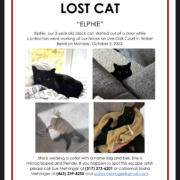 Elphie: 3 year old black cat wearing a collar, bell, and name tag. Microchipped. Very friendly