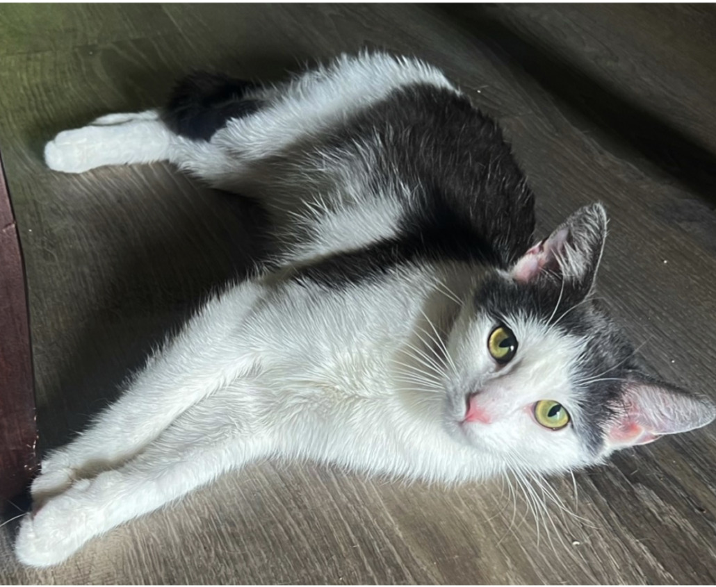 White and gray patched, very small cat has a large wound on the side of her neck.