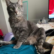 Super friendly, chunky. Has a slight pink color on his belly and underneath the neck. Will answer to Tonk, Chunks, chowdie.