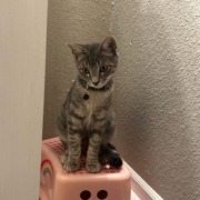 He’s got like light gray with dark gray stripes. He’s still kitten. He’s about 5 months old.