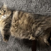 One year old maine coon/tabby mix. Long, fluffy hair. Very friendlly, usually comes when her name is called. Wearing a pink/orange/blue glittery collar with a bow and bell on it. Also has a purple tag with her name but the phone number on it is not accurate as of today 10/11.