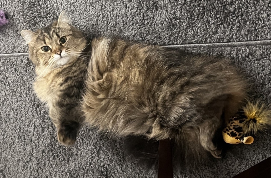 One year old maine coon/tabby mix. Long, fluffy hair. Very friendlly, usually comes when her name is called. Wearing a pink/orange/blue glittery collar with a bow and bell on it. Also has a purple tag with her name but the phone number on it is not accurate as of today 10/11.