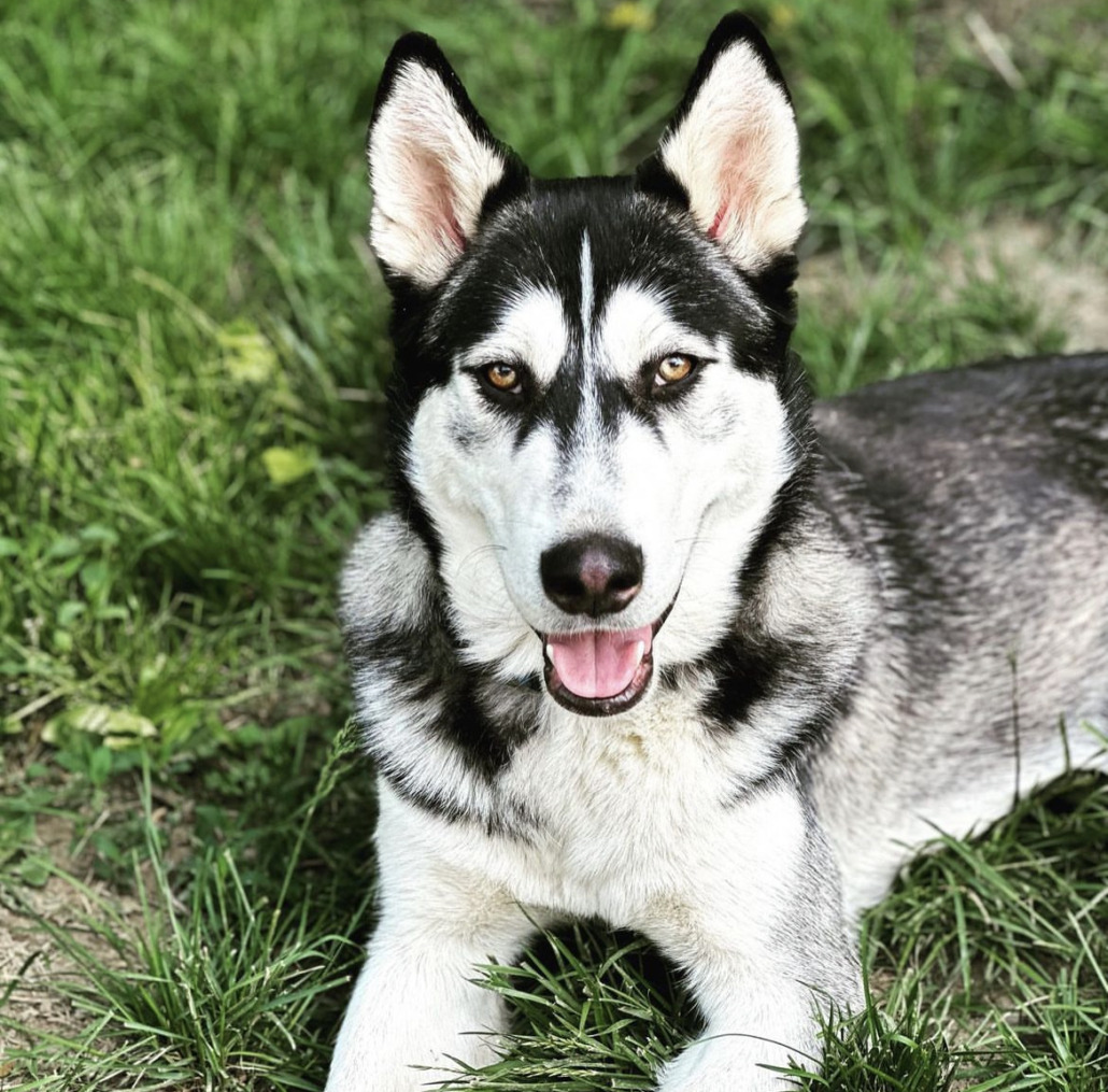 He is a black and white husky/malamute mix. He has erect ears with black backs and white insides. He has a split black and white face with a white stripe down his nose and a black butterfly shape in each eye corner. He has white chest and legs.
