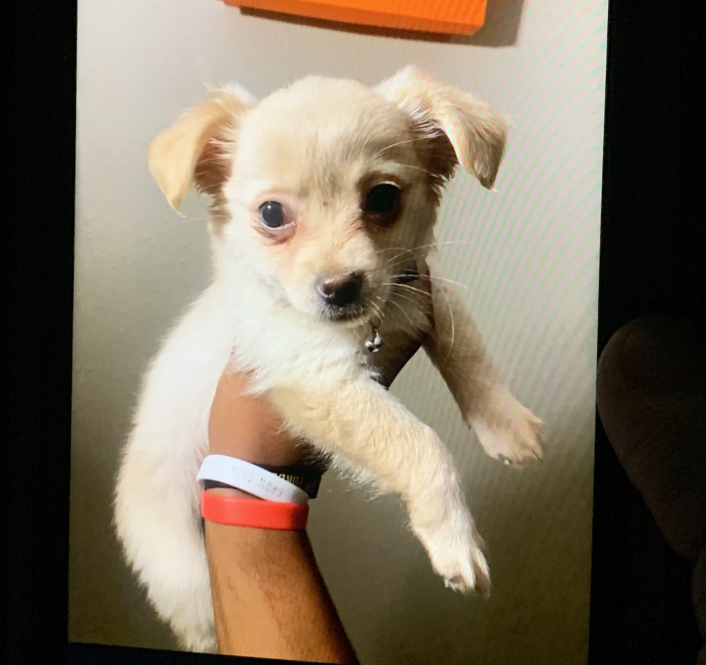 Posting for neighbor. Chihuahua/Maltese mix (?). 8 weeks old. Slipped her collar while outside on a leash/stakeout pole.