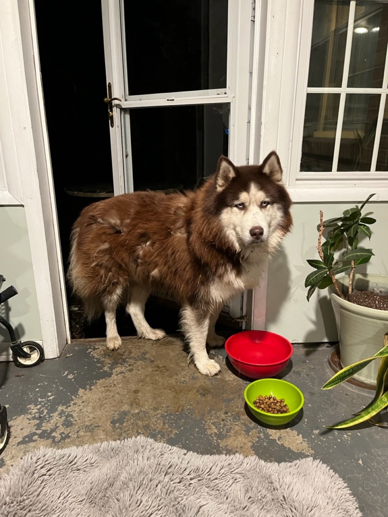 Possible Alaskan Malamute or Husky. Brown and white found wearing black collar with no tags.