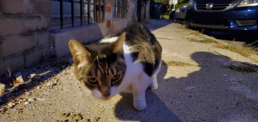 Very skinny, white and tabby. Very scratchy vocals, yeowly, but somewhat friendly. No collar. Would not allow itself to be caught