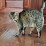 7 year old brown, black and grey tiger cat. The tip of her left ear has the tip clipped because she was a ferral cat before we adopted her. She has been an indoor cat for 5 years. Her one eye does not dilate, the pupil stays large.