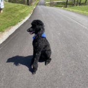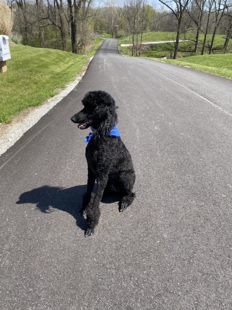 Large standard poodle. Freshly groomed and has leg bracelets. Wearing Blue collar.
