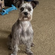 Brown eyes, grey hair, miniature schnauzer terrier, just got a schnauzer hair cut.