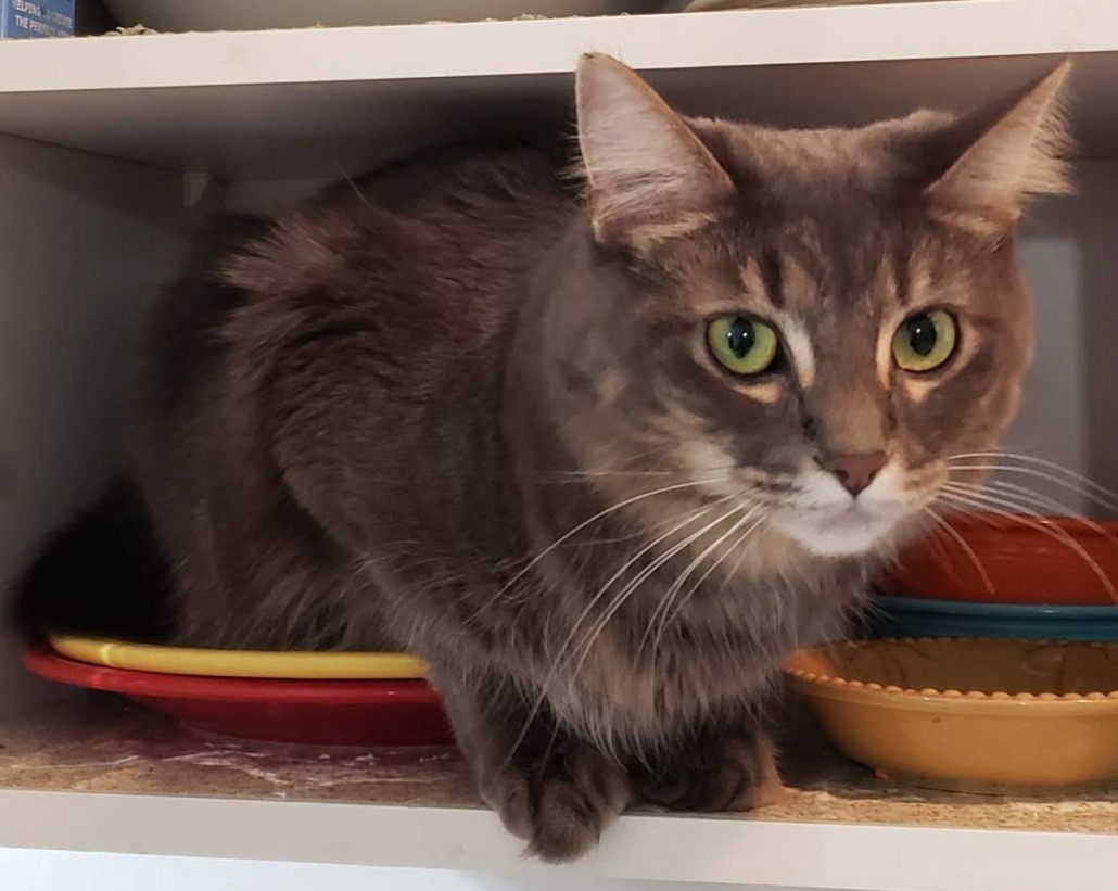 Flurry is a 3.5 yr old cat with fluffy hair and tail, white markings around her eyes, and a sociable personality.