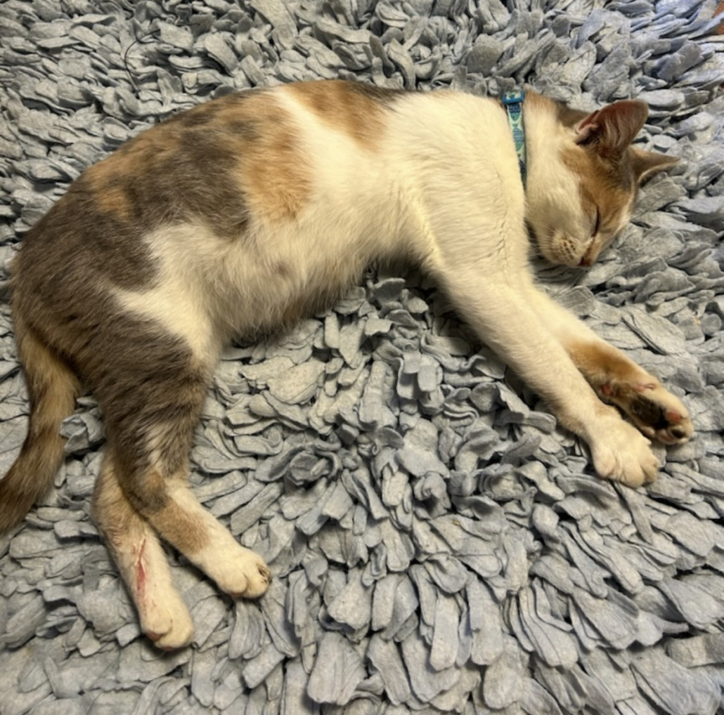 Small young cat sweet, female calico coloring with cream and yellow eyes, has a pink with flowers breakaway collar