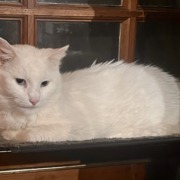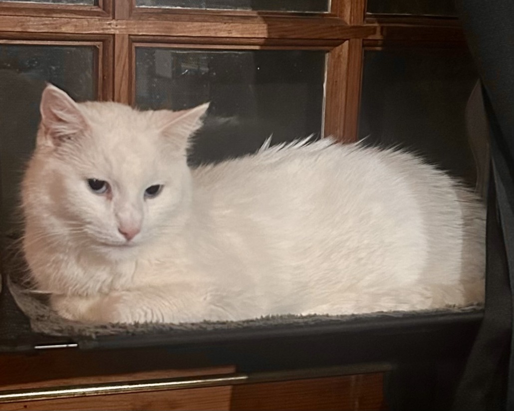 White cat with blue eyes. Not deaf but skittish around people and really only responds to his person.