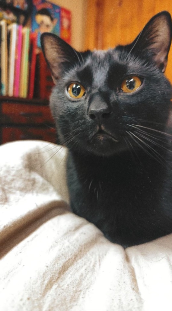 Black cat with pretty orange eyes. Very sweet boy and we want him home!!!