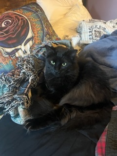 Mostly black fluffy large cat with a long belly fur that is slightly grey and a white spot on his belly. Only 2 years old and very well fed. Very friendly and vocal.