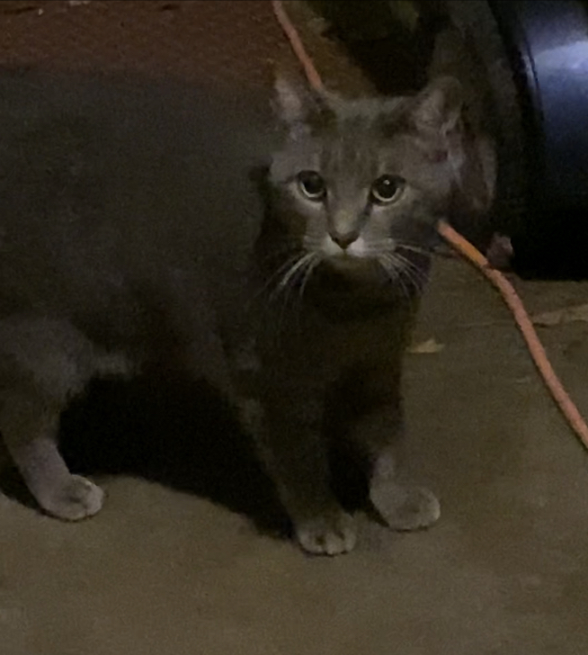 Very sweet adult cat. Gray with subtle tabby stripes. White around and mouth. Very friendly—even got in my car. Sex not known. Clean and seemed healthy but maybe lost.