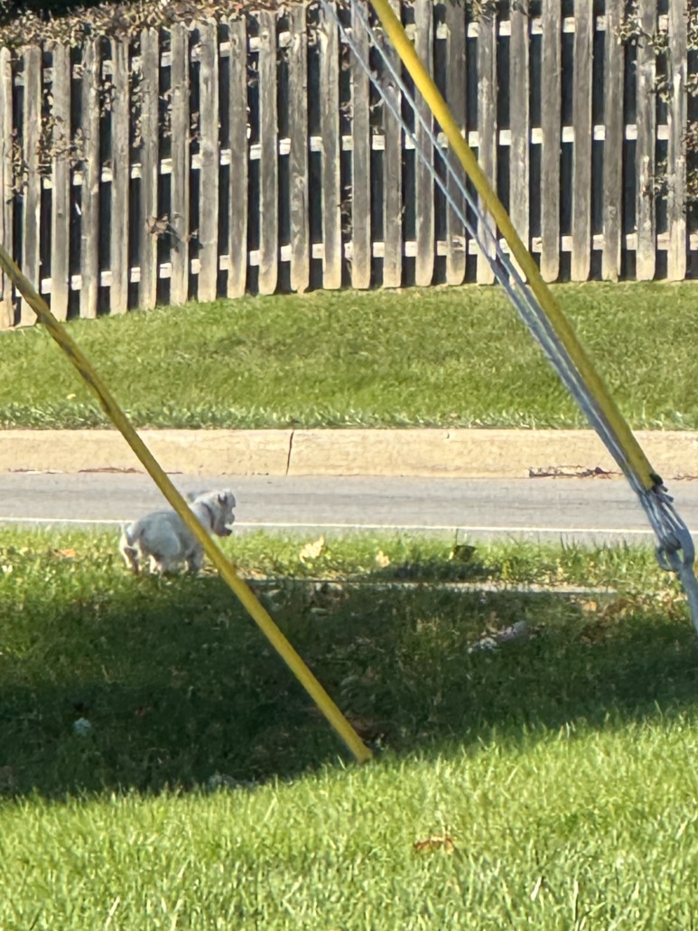 Small tanish white dog. Kind of scruffy and longer shaped body. Running full speed ahead. Someone said they were two.” But I only saw one. Running throughout neighborhoods and streets between Ditch and Harcourt and between 79th and Westlane Rd/73 rd.