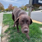 Large male neutered brown lab. Very friendly. Has a blue and red collar but no tags.