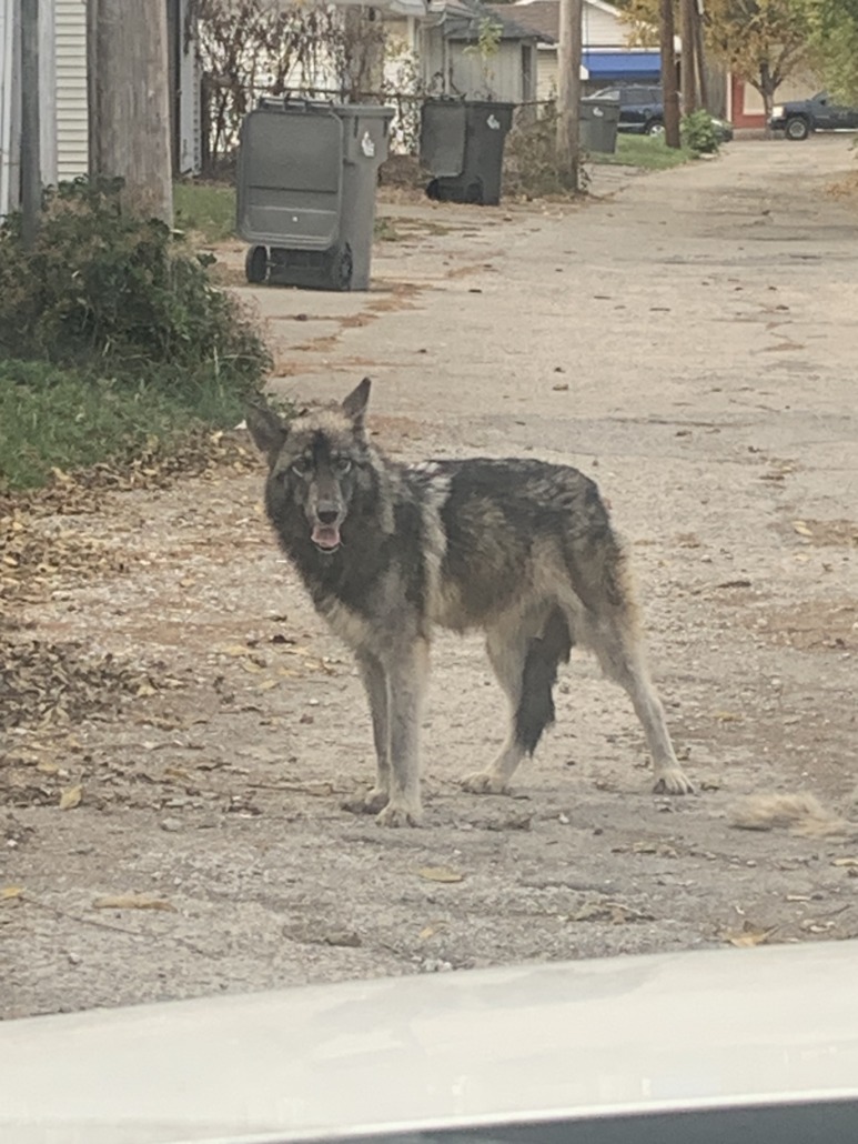 In alley, hungry and nervous but possibly friendly, was not phased by cars trying to drive past at all