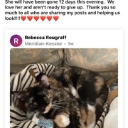 Lost Cat, Alert #63697 Pocahontas missing near Kessler Blvd. and Washington Blvd., Indianapolis46220
